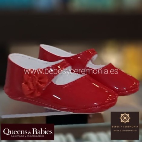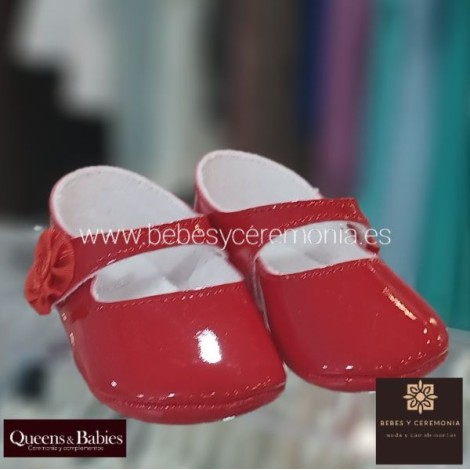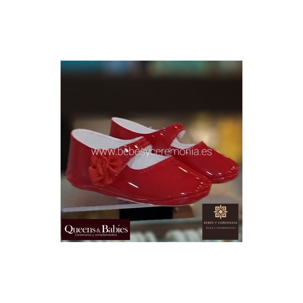 Zapato ideal para el bebé de primera puesta, tipo merceditas, bajo confeccionado en charol rojo.
