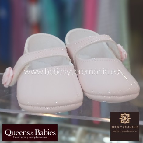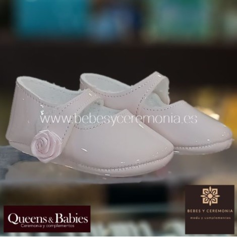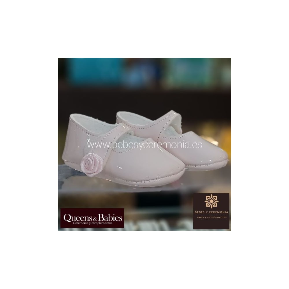 Zapato ideal para el bebé de primera puesta, tipo merceditas, bajo confeccionado en charol rosa.