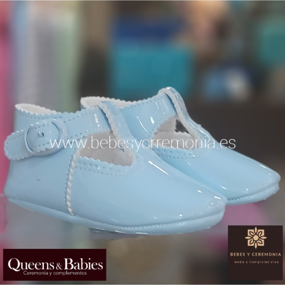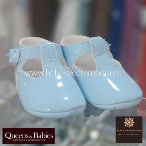 Zapato de bebé de Cuquito, en color azul celeste acabado charol. Calzado sin suela para bebés y preandantes con cierre con hebilla para una mejor sujeción.