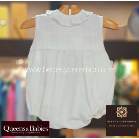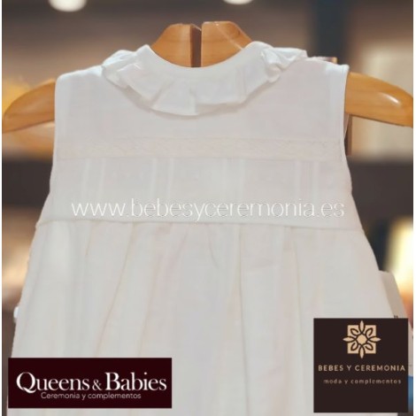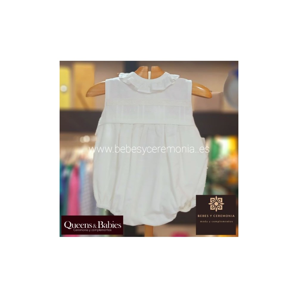Ranita bautizo en tono beige de manga corta y pequeño detalle de volante en el cuello. Se abrocha con botones en la espalda