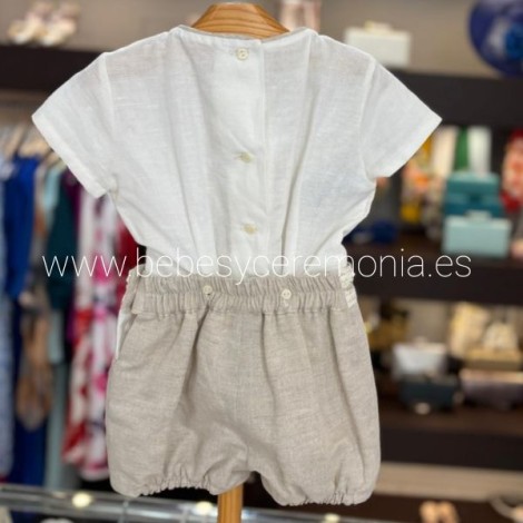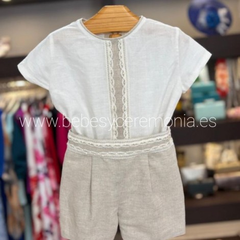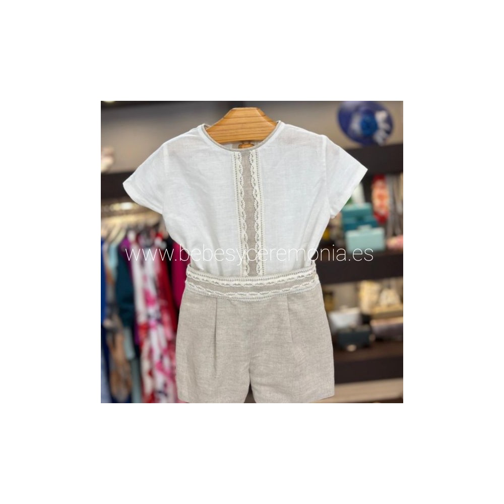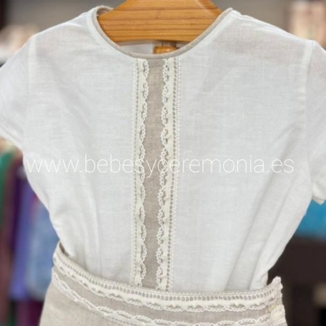 Camisa de manga corta con elegante jaretita bordada y abotonada por la espalda. Pantalón con misma jareta que la camisa en la cintura.
