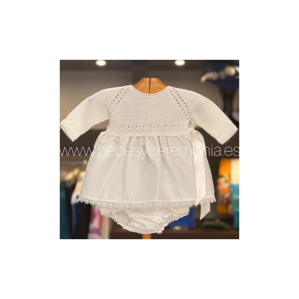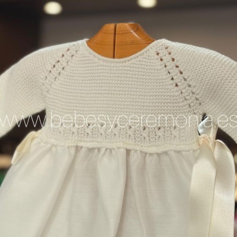 Elegante vestido de bautizo o ceremonia. Confeccionado el cuerpo de excelente punto, lacitos en los laterales y puntilla en el bajo.