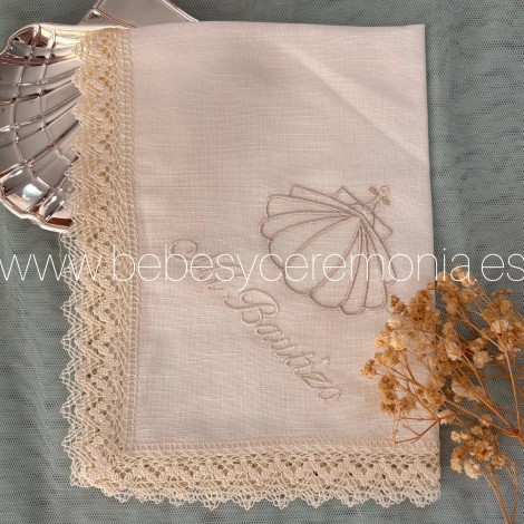 Pañuelo de bautizo para la ceremonia de lino, bordado y con puntillas. Un regalo perfecto para tener un recuerdo inolvidable.