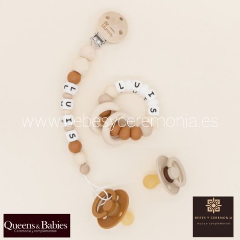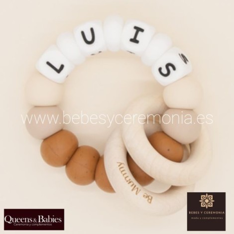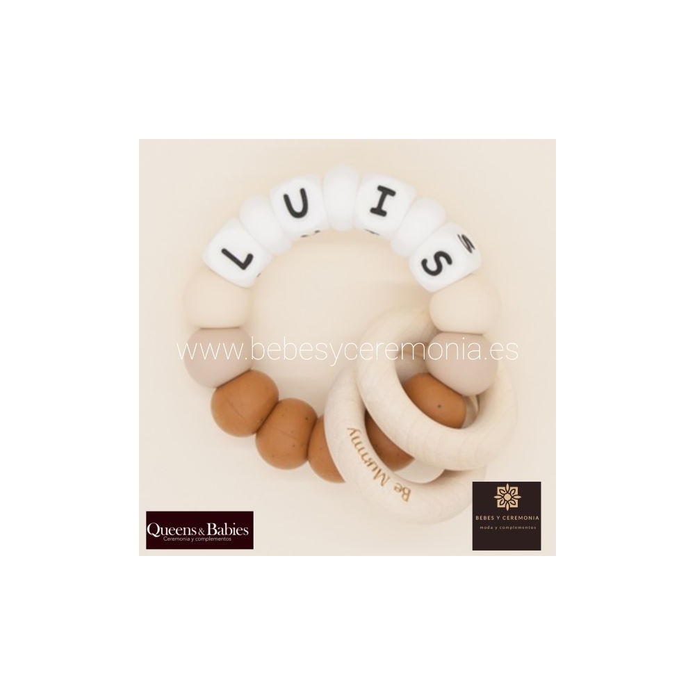 Estos mordedores personalizados con el nombre del bebé, ayudarán a tu bebé a calmar las inflamadas encías. Son muy fáciles de agarrar, además, el tintineo de su doble anilla al chocar, hace un ruidito súper agradable que lo dejará hipnotizado. La colección de mordedores personalizados Speckled, combina el color beige con las famosas bolitas de colores de motitas negras. Un diseño moderno, atemporal, elegante y completamente unisex.
