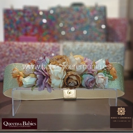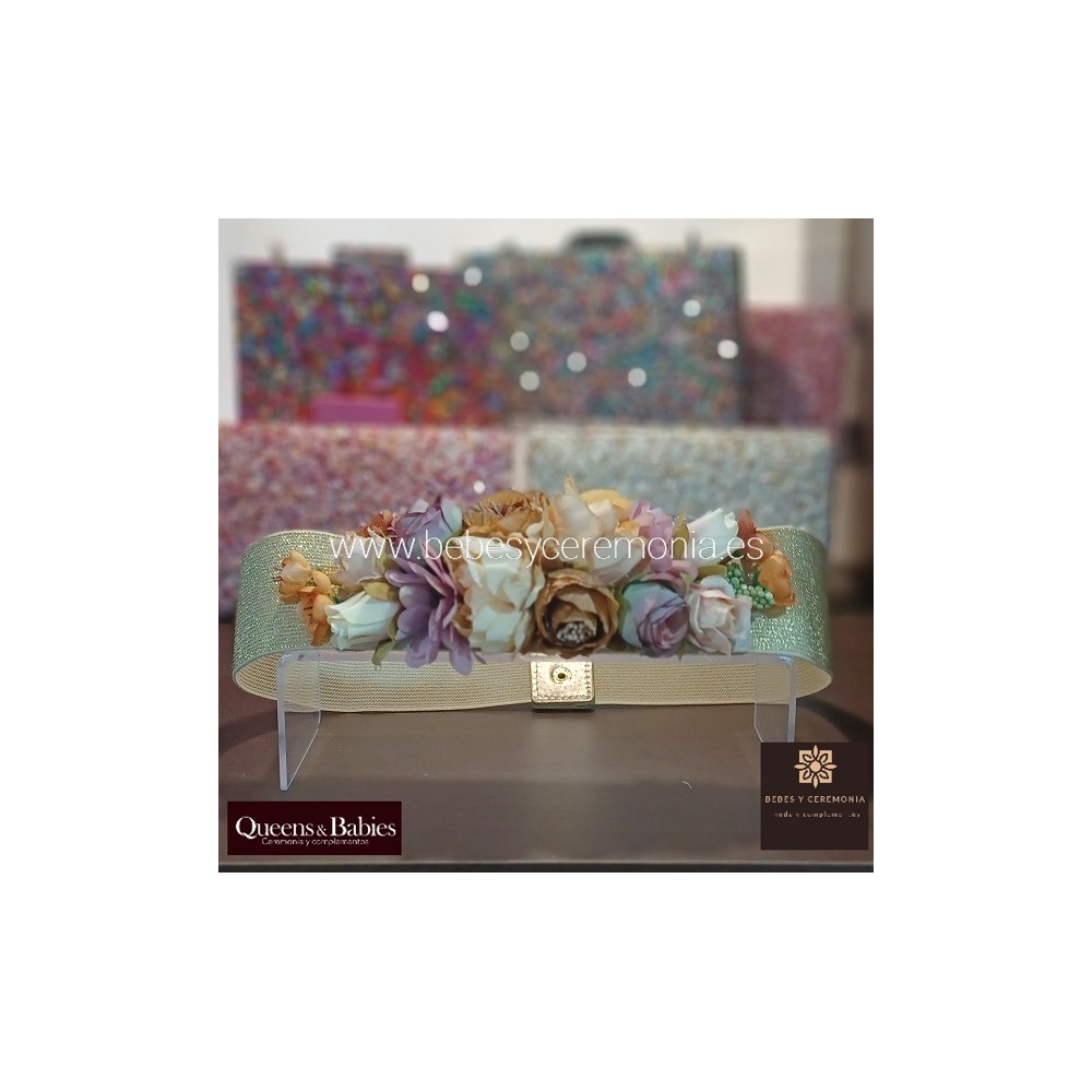 Elegante cinturón floral con goma, para dar ese toque al vestido y completar tu look de invitada perfecta para tus evento.