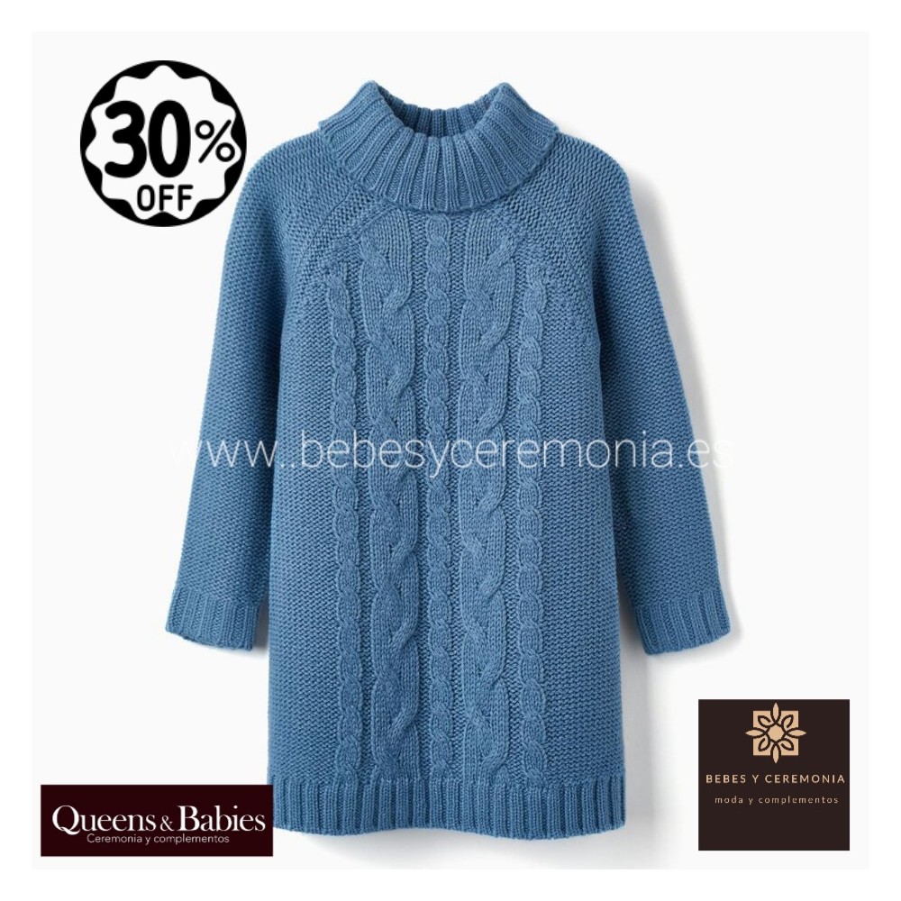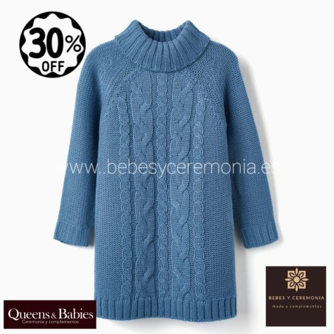 Vestido de punto rosa con cuello alto para niña. Con detalles de punto trenzado en la parte delantera. Extremos acanalados para un mejor ajuste.