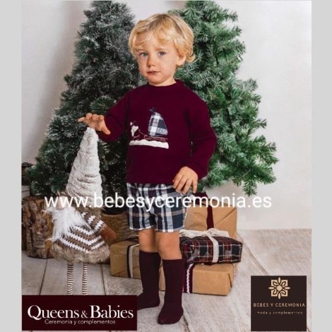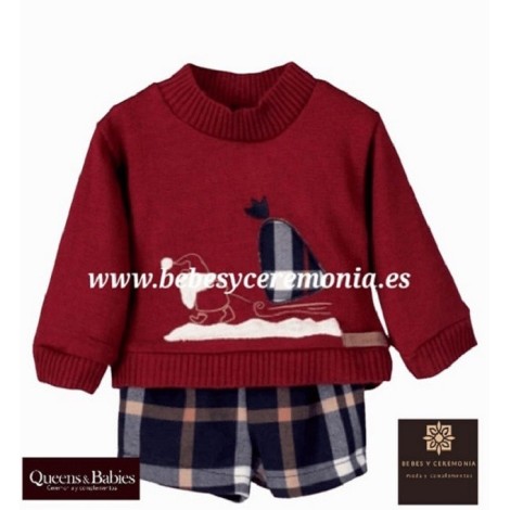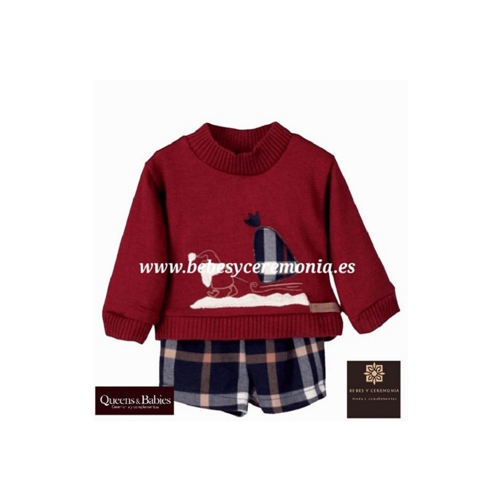 Conjunto 2 piezas de la colección "Viborg". Compuesto por pantalón corto confeccionado en tejido a cuadros en tonos azules y jersey a juego en tono granate con aplique bordado.