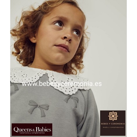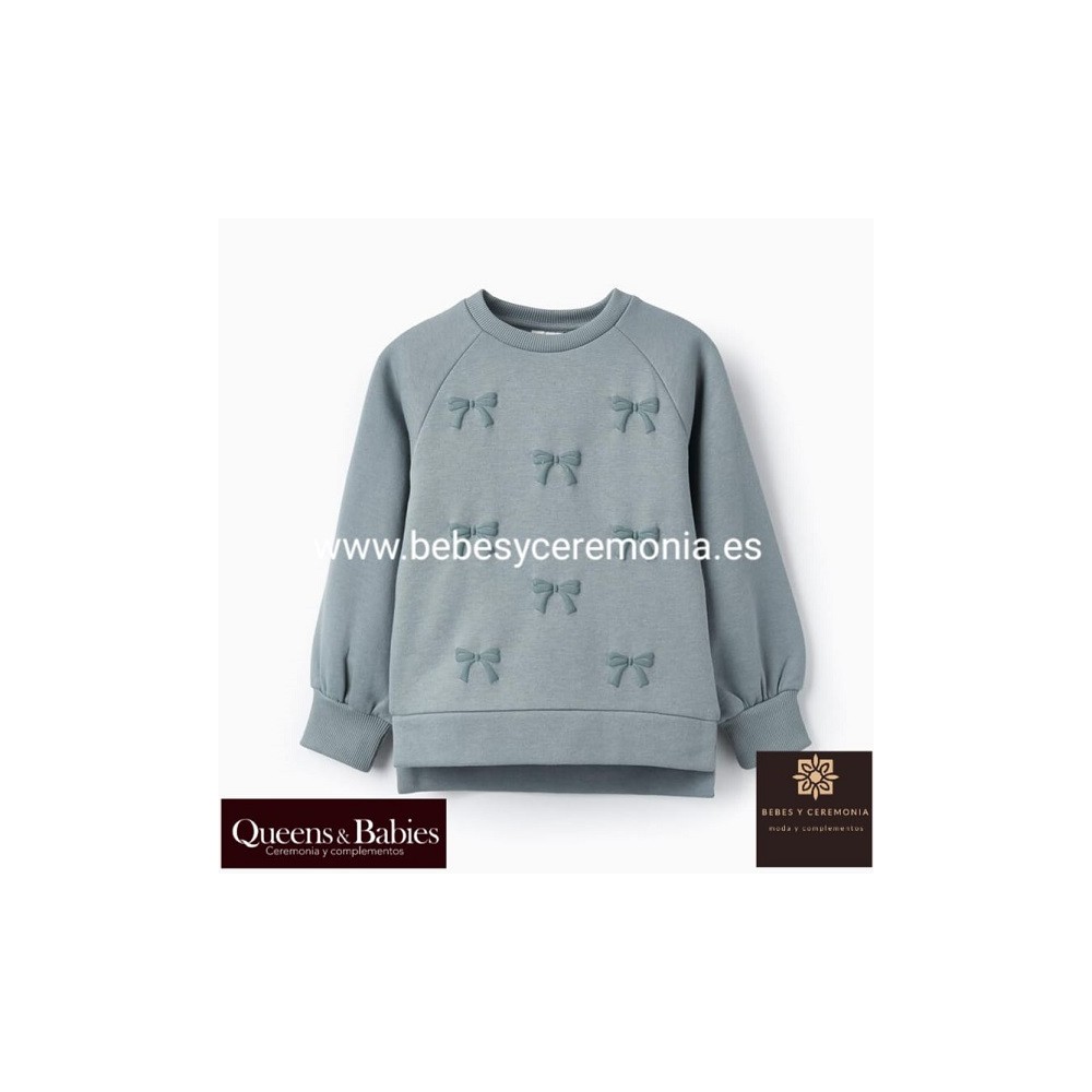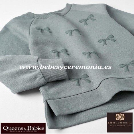 Sudadera gris azulada para niña, con estampado frontal de lazos en relieve. Sin mangas raglán.