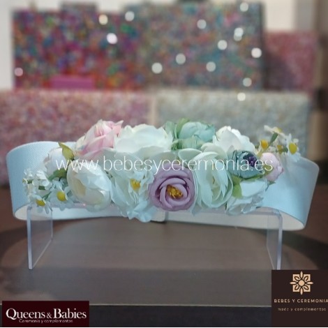 Elegante cinturón floral con goma, para dar ese toque al vestido y completar tu look de invitada perfecta para tus evento.