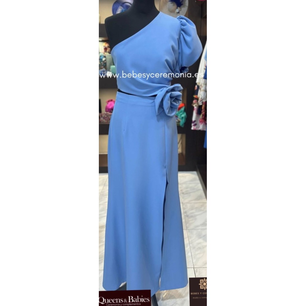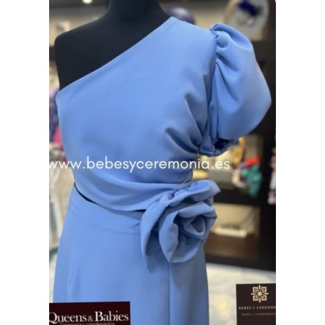 Detalle con pequeña apertura en la cintura. Escote asimétrico y manga con frunce. Rosa en mismo tejido. Cremallera invisible en espalda. Lleva forro interior.