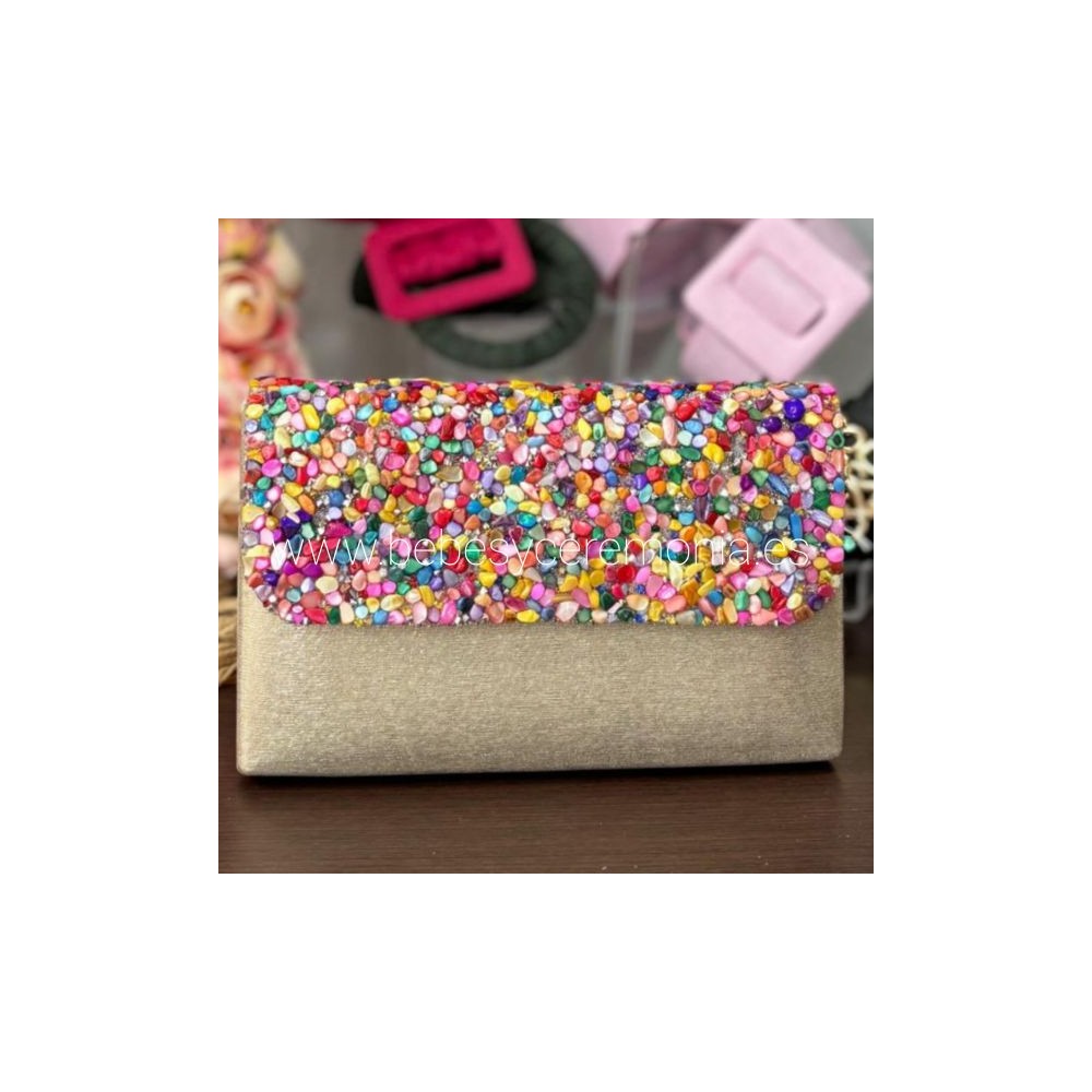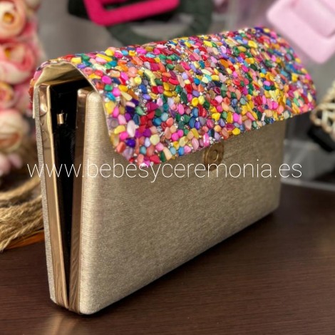 Elegante cartera de fiesta, combinando el cuerpo en forma de caja dorada y una espectacular alegre solapa multicolor.