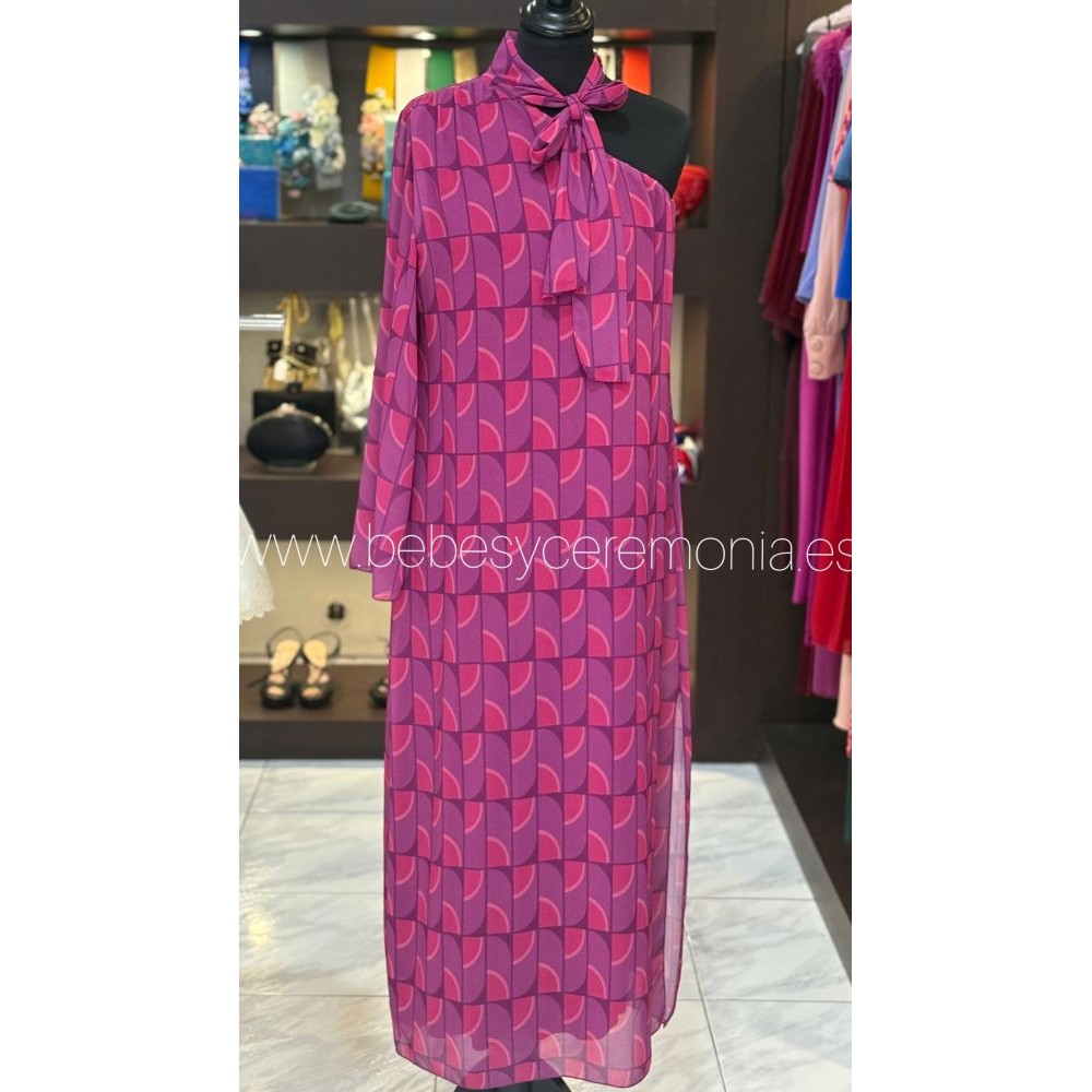 vestido estampado asimétrico con detalle lazo en el cuello y pequeña abertura en su lateral del vestido.