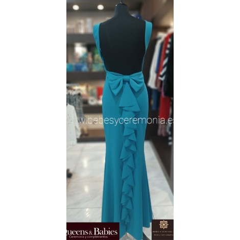 Destaca su elegante espalda, dejándola al descubierto y con detalle en falda de lazo y volante.