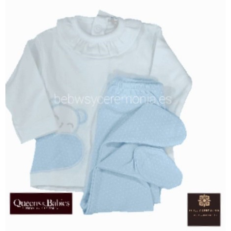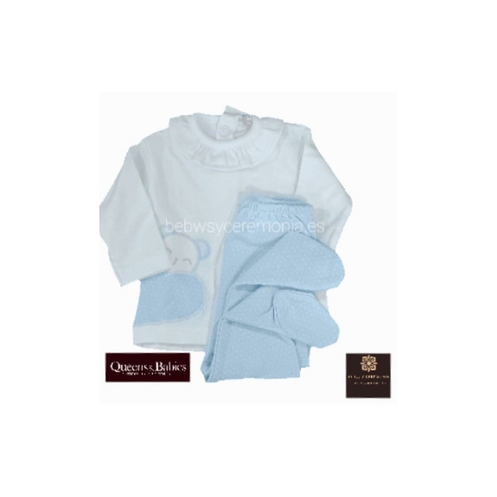 Conjunto de 2 piezas bebé compuesto por camiseta de mana larga con cuello volante y polaina.