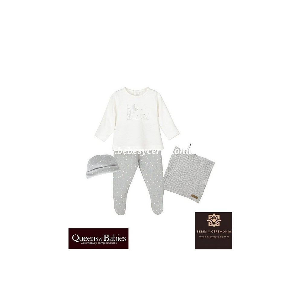 Jubón + polaina, gasa muselina a juego y gorrito.