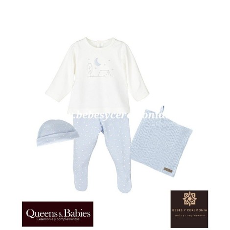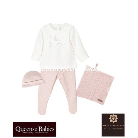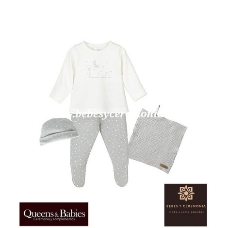 Jubón + polaina, gasa muselina a juego y gorrito.