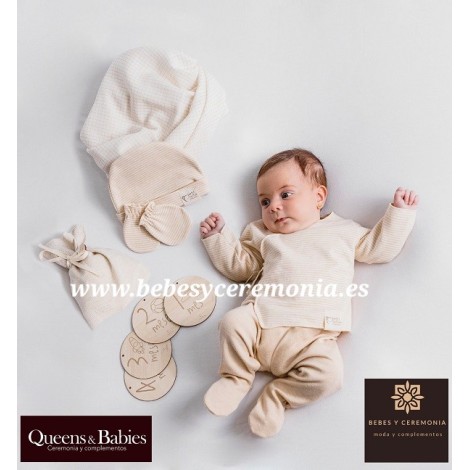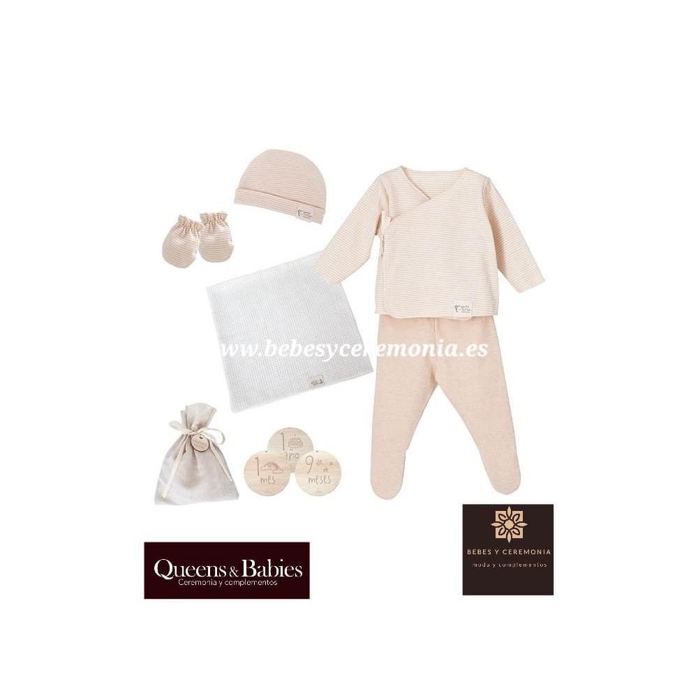 Jubón, polaina, gorrito, manoplas, gasa muselina, bolsita con las piezas del cumplemes y caja regalo.