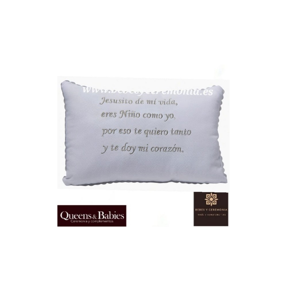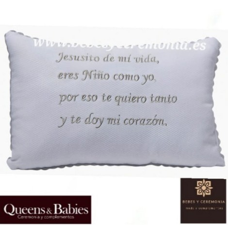 Cojín de piqué bordado con la frase "Jesusito de mi vida". Ideal para regalar en nacimientos, bautizos, cumpleaños o comuniones Para decorar la habitación de cualquier niño/a Se confecciona de manera artesanal con tejidos de piqué de primera calidad.