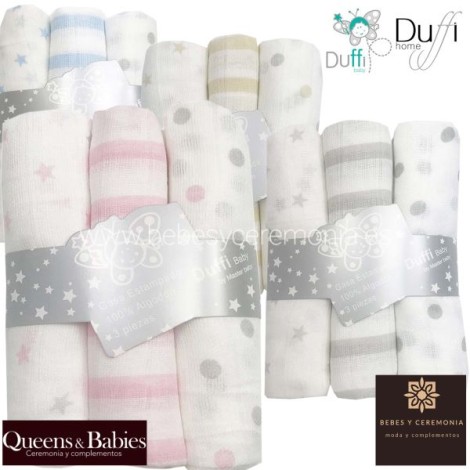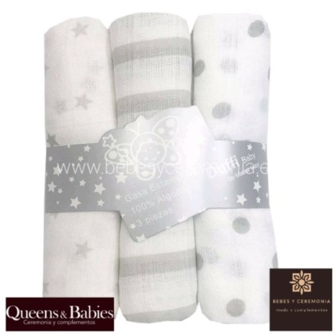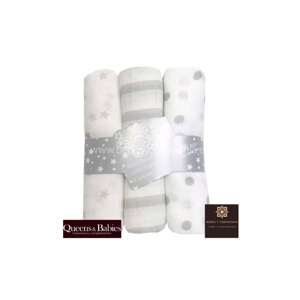 Pack de 3 gasas de muselina de algodón bebé, estampadas con un divertido de topos, rayas y estrellitas