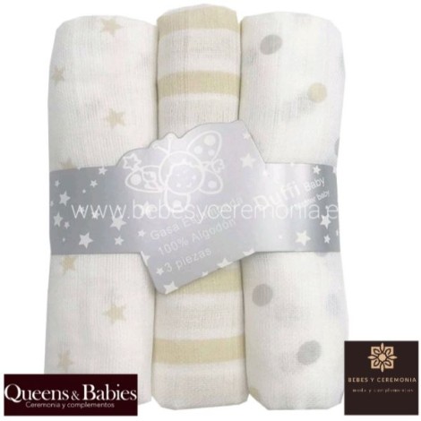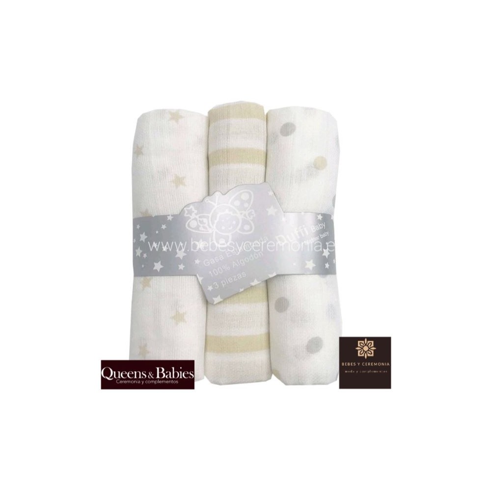 Pack de 3 gasas de muselina de algodón bebé, estampadas con un divertido de topos, rayas y estrellitas