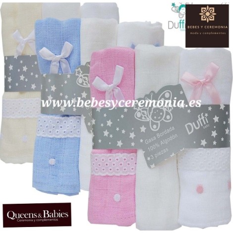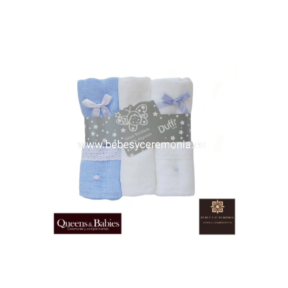Pack de 3 gasas de muselina de algodón bebé, bordadas.