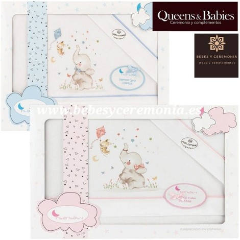 Juego de tres piezas de cuna, con el motivo del "elefante". Estas sábanas al ser de algodón son transpirables y fresquitas para el verano.