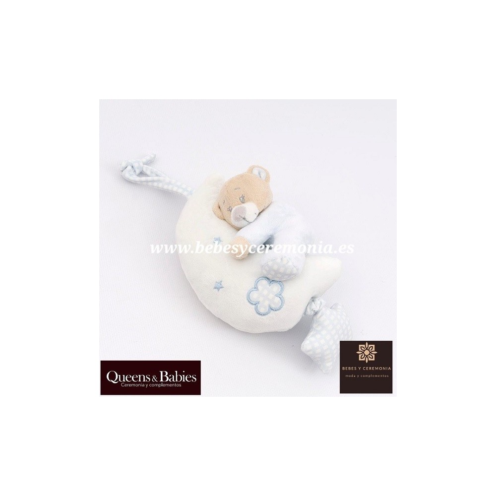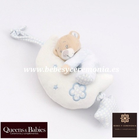 El peluche oso dormilón musical en una luna de tacto aterciopelado con un colgador con un hojal de la cuna.