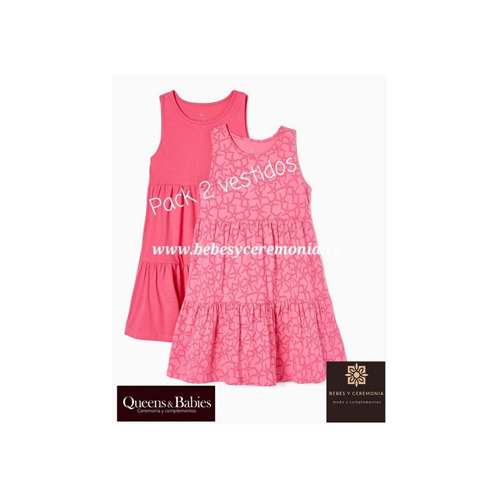 Vestidos sin mangas para niña. Uno con estampado de peces y otro liso. Corte evasé.