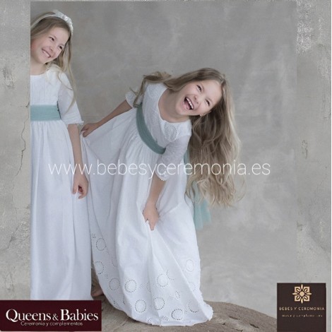 Vestido de Comunión realizado en plumeti con bajo de doquetes perforados, con una margarita en relieve.