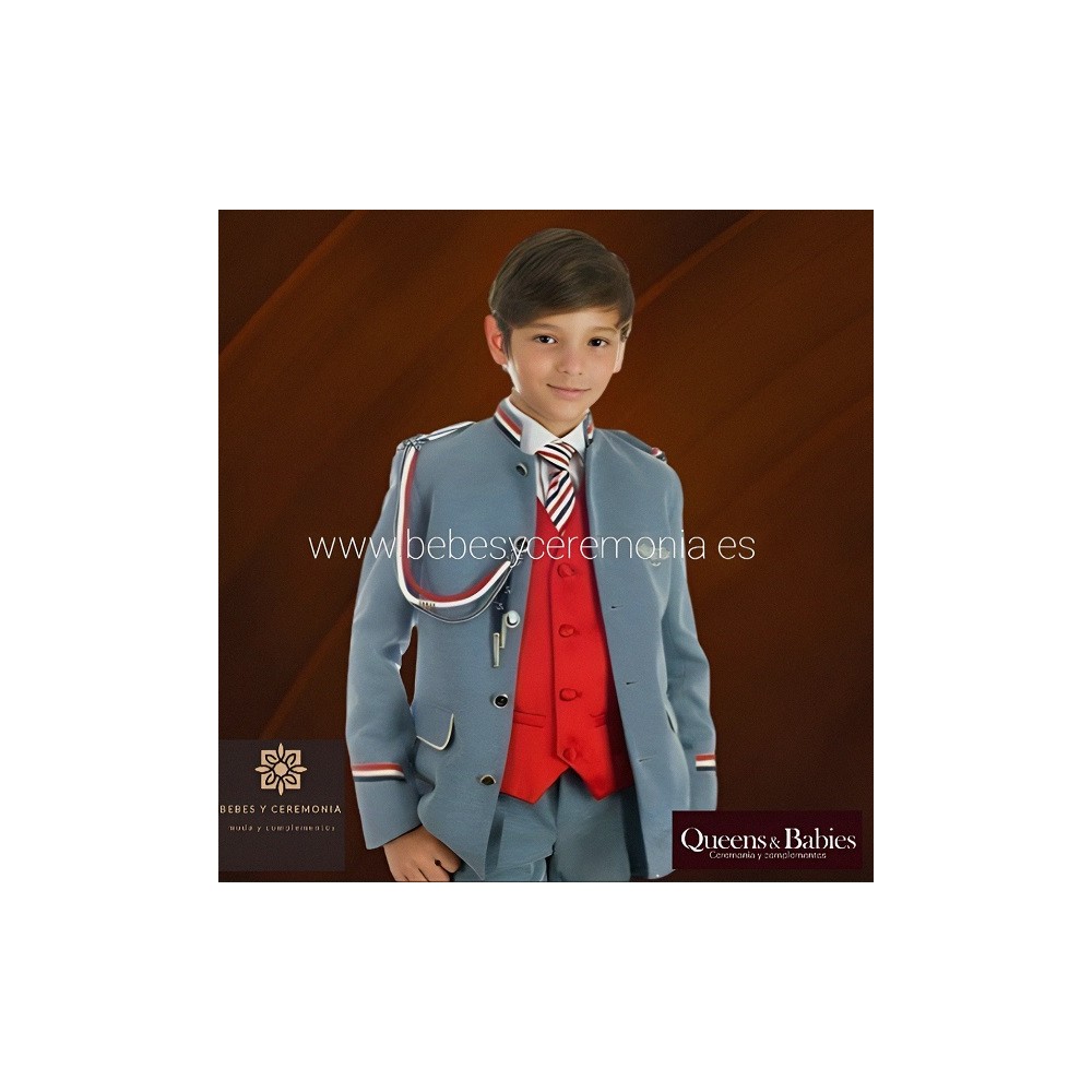 Traje de Comunión con cuelo mao en color azul claro con adornos en rojo, blanco, azul marino.