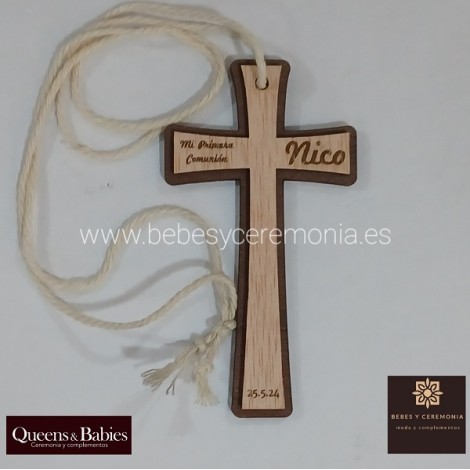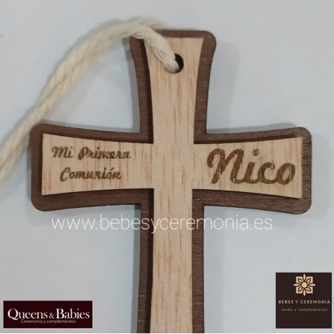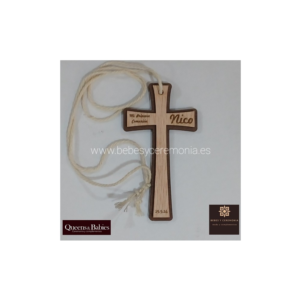 Elegante y original cruz para la Primera Comunión. Realizada en relieve sobre base de madera