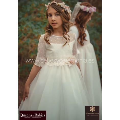 Elegante vestido de Comunión, confeccionado en organza y cuerpo de plumeti.