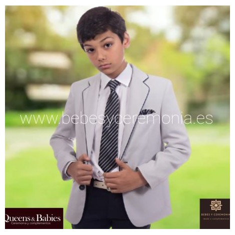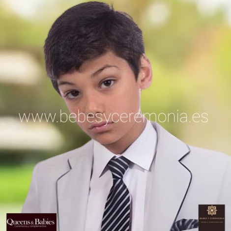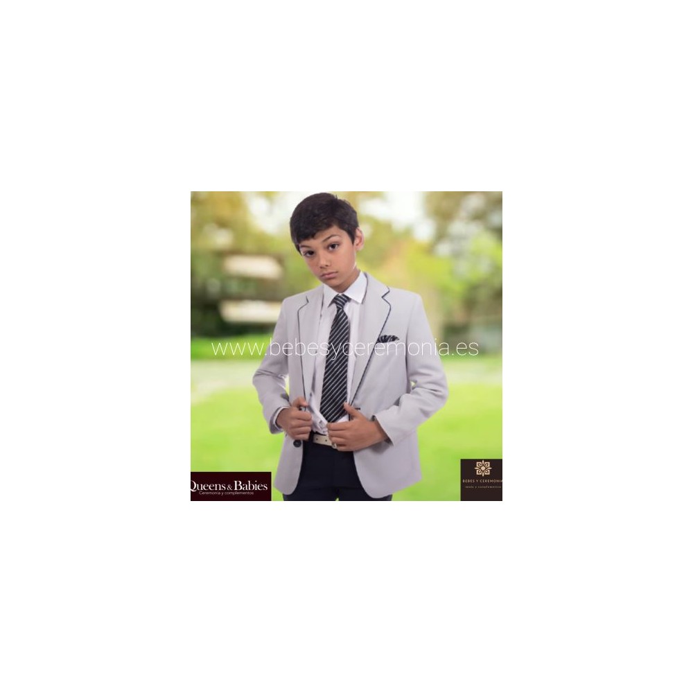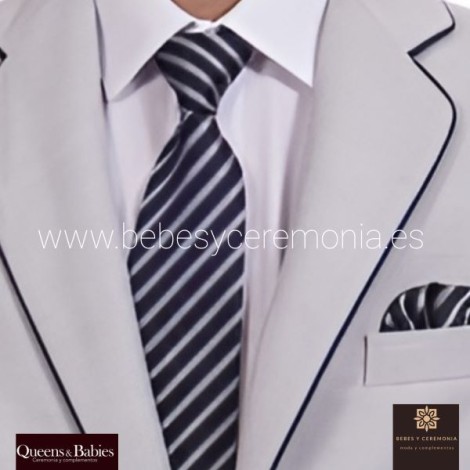 Compuesto de americana tono gris, pantalón marino, camisa y corbata a rayas y pañuelo