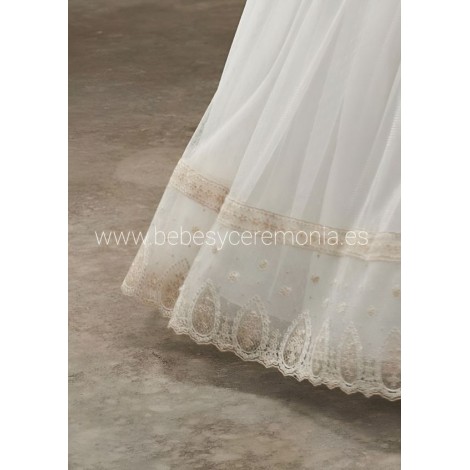 Confeccionado en tul de plumeti, lleva el cuerpo fruncido y las mangas son abullonadas y largas rematadas por una elegante puntilla en tono beige tostado. La falda confeccionada en tul tiene un remate por una elegante puntilla.