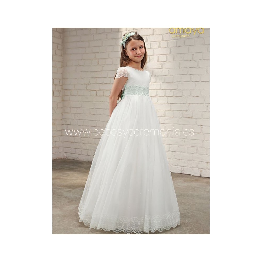 Vestido de Comunión de estilo romántico, con el estilo personalizado de la firma Amaya.