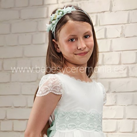 Está creado en un tejido de alta calidad, con tejido de tul bordado en el bajo de la prenda y en las mangas, donde destaca el bordado del bajo. Fajín en tono verde agua.
