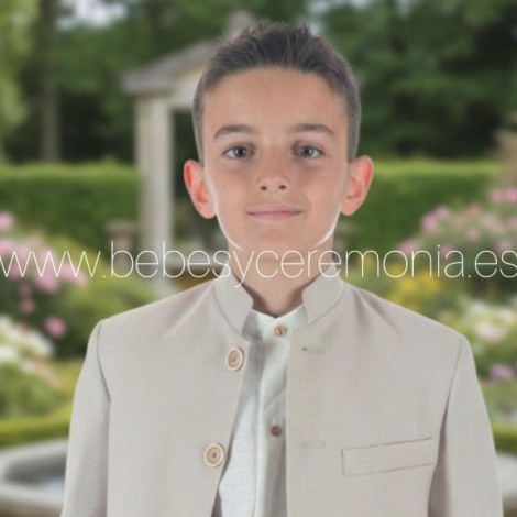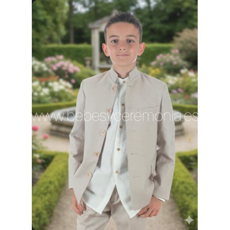 Traje compuesto por americana cuello mao beige, pantalón beige y camisa mao lino.
