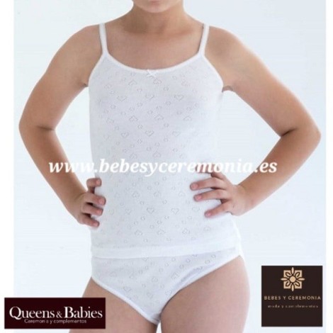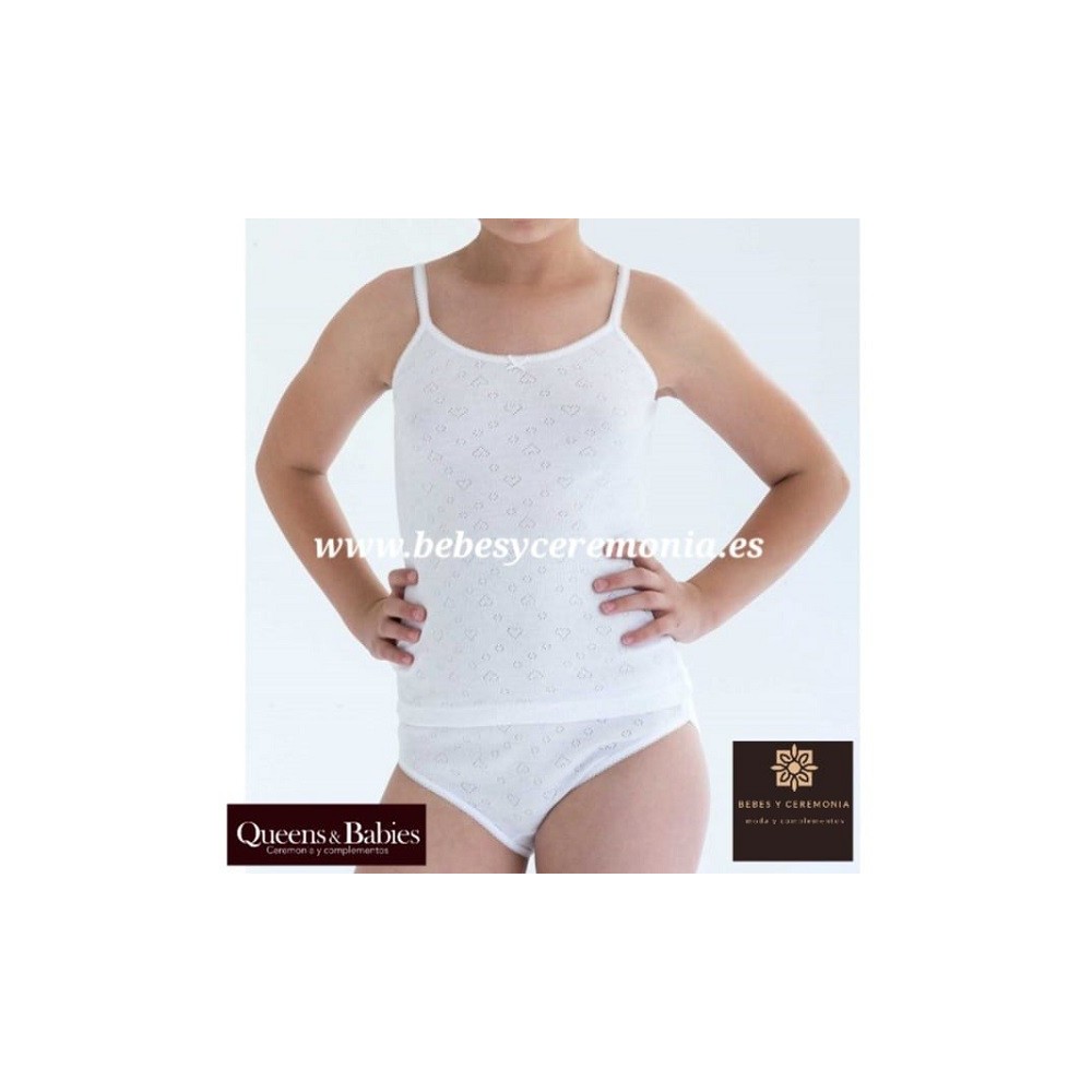Conjunto calado de camiseta de tirantes y braguita infantil. Detalle de pasamanería y lazos en el escote y la btraguita.